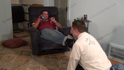 With the slave in a tuxedo, and Roberto in jeans, sneakers, blue sweaty athletic Under Armor socks & T-shirt, the wedding cake is served at his feet. He eats his while his toes & feet play with slave's face and he watches football. Then some "blackmail" wedding photos are takes to further humiliate the foot slave. He then goes back to watching football and forces his slave to just lay beneath his feet and look at them while another consummation takes place! More of a foot stool and foot massage. Too much of a fantasy to put into words - you just gotta see it! Much teasing, foot action (both socked and bare foot & the works. Three sensational camera angles & views of this scene. This scene is HUGE and takes four films to cover the entire sensational event. This whole wedding event is so erotic and the ULTIMATE fantasy for every foot slave to marry the feet of a Straight Master.