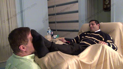 After work, Roberto has his sissy pinned at his macho feet to worship while he sits back in a lazy boy recliner! In slacks, sweater & sweaty dark dress work socks, Roberto sits back to tease, laugh & control his sissy slave while forcing him to whiff his socks & laughing at him & teasing his “bitch” at his feet. He some question from fans on the website, while sock worship & bare foot licking, kissing....... (click video link to see full description)